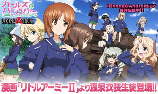 戦車道大作戦実行委員会(株式会社博報堂 DY ミュージック&ピクチャーズ、株式会社モブキャストゲームス)は、iOS/Android向けゲーム『ガールズ&パンツァー 戦車道大作戦!』において『ガールズ&パンツァー』の漫画作品『ガールズ&パンツァー リトルアーミーⅡ』より温泉衣装生徒登場についてお知らせいたします。