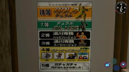 港には休憩所があり,ここでしか買えないガチャガチャがあったりする。バイトが終わればドブ板に帰って行動することもできるので,旅費のために稼いでいるはずのバイト代を己の欲望で使い果たすのもまた一興だ。ここが「シェンムー」の最も楽しい時期かもしれない……。