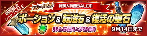 体力が回復する「ポーション」、指定した拠点やダンジョンに瞬間移動できる「転送石」、バトル中に復活できる「復活の聖石」等のアイテムが、まとめ買いで特別セール中です!