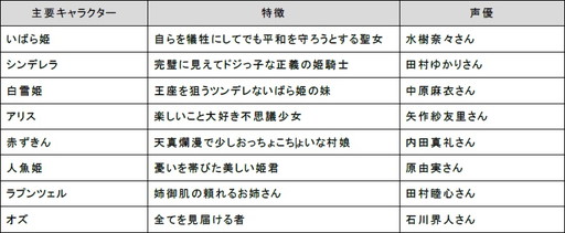本作では、シンデレラ、白雪姫などプレイヤーが仕えることになる6名の姫のほかに総勢60名以上の個性的なキャラクターが登場します。そして、水樹奈々さん、田村ゆかりさん、内田真礼さん、石川界人さんなど、人気の声優陣が主要キャラクターを演じています。