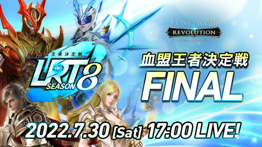 ネットマーブルは、スマートフォン向け超巨大マルチバトルRPG『リネージュ2 レボリューション(Lineage2 Revolution)』(略称、リネレボ)において実施している、最強血盟を決める要塞戦イベント「LINEAGE2 REVOLUTION TOURNAMENT 血盟王者決定戦 SEASON8」(以下、「LRT SEASON8」)の決勝戦イベント「LRT SEASON8 FINAL」を7月30日(土)17:00より開催し、YouTube Liveにて生放送することをお知らせいたします。