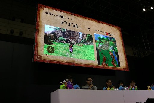 「ドラゴンクエストXI」はPlayStaion 4とニンテンドー3DSをプラットフォームとしてリリースされるが,堀井氏はこの理由を「より多くの人に遊んでほしいから」と説明。また3DS版は本体上側の画面に3Dグラフィックスバージョン,本体下側の画面に2Dグラフィックスバージョンを連動表示する仕様となっているが,堀井氏いわく「かなり無茶」とのことで,齊藤氏も「PS4版も含めて,実質3バージョンを作っているようなもの」と表現していた。