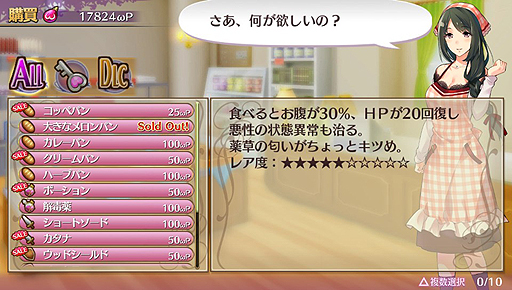 ![]() 購買……アイテムを売買できるほか,購買部のお姉ちゃんこと天乃夢美(あまのゆみ。CV:井上喜久子)との会話も可能。PlayStation Storeというメニューでは,11月19日から配信されるダウンロードコンテンツを購入できる。メニュー画面に水着や下着を身に着けたキャラクターを表示できるのだとか |