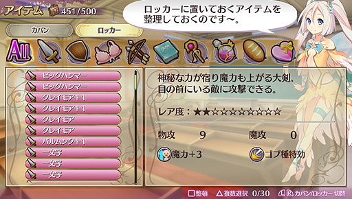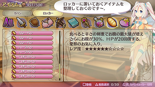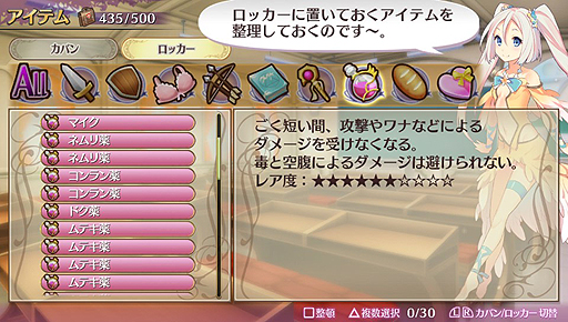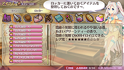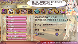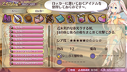 ![]() アイテム……アイテムを管理する。格納場所は大きく「カバン」と「ロッカー」に分かれており,それぞれ30個,500個のアイテムを収納できる。ダンジョンでの探索ではカバンのアイテムのみ出し入れが可能 |