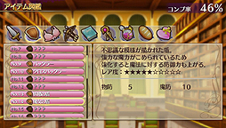 装備品や,矢,あるいは石といった戦闘で使う投擲系を除いて,アイテムは大ざっぱに,魔導書,杖,薬,パン(食料),お香(その他,お香関連アイテム)に分けられる。以下でざっと,どういったものがあるのかを紹介しよう。