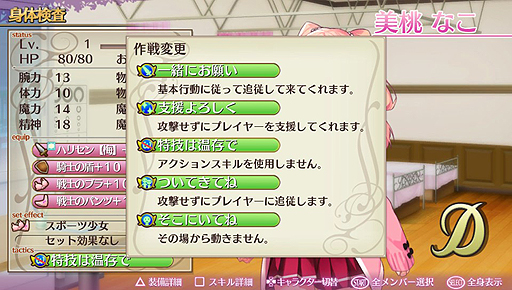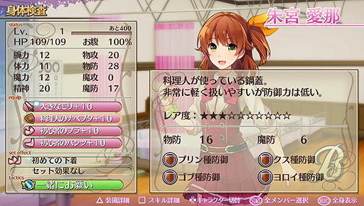本作におけるプレイアブルキャラクターの装備は,武器,盾,ブラ,パンツ(以下,とくに区別しない場合は下着とする)の計4か所だ。剣やヤリ,オノなどの武器は攻撃に使用し,盾と下着は防御力を高めるために装備する。盾やブラは主に物理攻撃に対する,パンツは主に魔法攻撃に対する防御力が,それぞれ上がる。