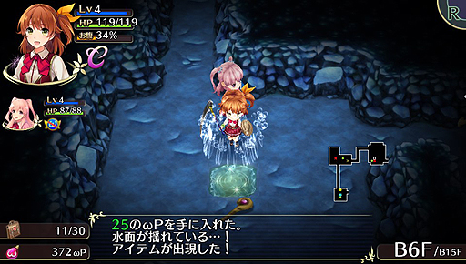 また,「モンスターフロア」という,モンスターとワナ,落ちているアイテムだけのフロアもある。戦闘不能になる危険もあるが,経験値やωP稼ぎには有効なフロアだ。