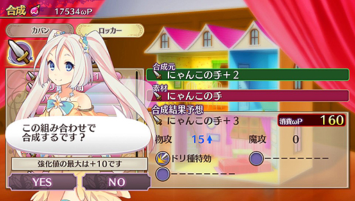 武器,盾,下着は,すべて「合成」によって強化できるのもポイント。同じ種類の装備品同士を合成することで,武器は攻撃力が,それ以外は物理/魔法防御力がそれぞれ上がるが,実は合成の効果はそれだけではない。