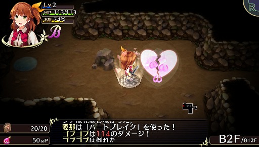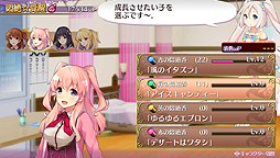 スキルは,キャラクター固有のものを数種類覚えてそれを強化できるようで,主人公・愛那の「ハートブレイク」の場合は「前方1マスのモンスターにダメージを与え,さらに15ターンの間,自分の物理攻撃力と物理防御力をアップする。受けた相手は体と心に傷を負う」という(最後以外は)分かりやすいものとなっている。