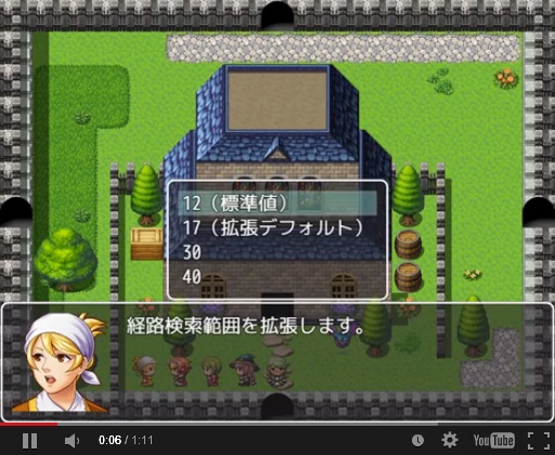 ゲーム内で使っている様子とこの処理のサンプルムービーを作成したので,検索範囲の拡大がどういった内容の処理なのかを確認しておいてほしい(実はこのサンプルムービーを撮るためにプラグインコマンド化したわけだが)。