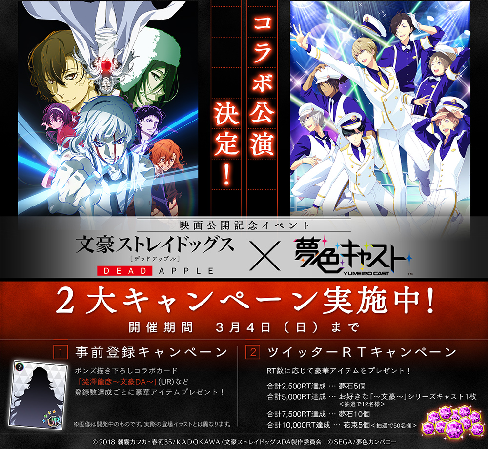 「夢色キャスト」,映画「文豪ストレイドッグス DEAD APPLE」コラボを2018年春に開催。コラボ記念2大キャンペーンを実施中
