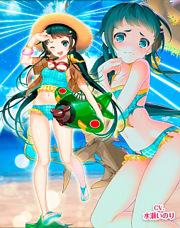 水兵服に合わせた帽子と浮き輪で、涼しさを演出。少しでも体型をグラマラスに見せる為のボーダー柄水着に、彼女なりのプライドが伺える。腰には完全防水のポーチ、ヘッドフォンも防水仕様にし、海での音楽鑑賞も完璧。ただ、ヘッドフォンの防水は海水に対応しておらず、それを知らぬまま海へ浸り、帰らぬ物となった。本人曰く、「壊れても貝殻より綺麗な海の音がするよ〜」とのことだが、「涙目でそう訴えられても困る」と同僚からの意見多数。