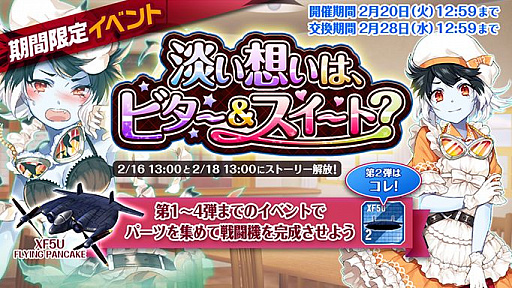 今回のイベントから新戦闘機「XF5U」の第二弾パーツが登場!! 第一弾〜第四弾までパーツを集めると製造が可能に……! 第二弾パーツは「淡い想いは、ビター&スイート?」の交換所で入手可能のため、逃さずにゲットしよう! 第三弾〜第四弾は次回イベント以降で登場!