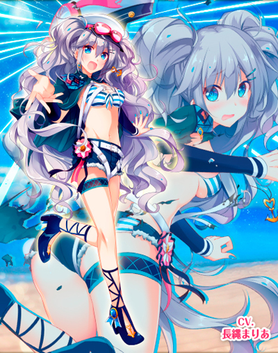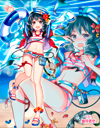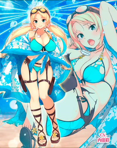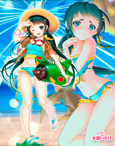 水兵服に合わせた帽子と浮き輪で、涼しさを演出。少しでも体型をグラマラスに見せる為のボーダー柄水着に、彼女なりのプライドが伺える。腰には完全防水のポーチ、ヘッドフォンも防水仕様にし、海での音楽鑑賞も完璧。ただ、ヘッドフォンの防水は海水に対応しておらず、それを知らぬまま海へ浸り、帰らぬ物となった。本人曰く、「壊れても貝殻より綺麗な海の音がするよ〜」とのことだが、「涙目でそう訴えられても困る」と同僚からの意見多数。
