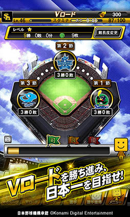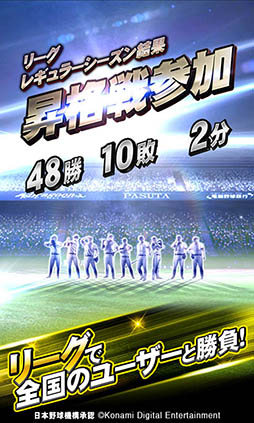 セ・パ12球団と対戦。試合は自動で進み、ピンチやチャンスの場面では出番が発生。試合を決定付ける活躍をして勝ち星を積み重ねて、日本一の座を目指そう!