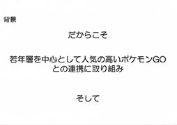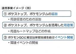 具体的な施策として,ポケストップとポケモンジムの設置,それらを活用した周遊ルートマップの作成,Pokémon GOと被災地域を結ぶイベントの開催が検討されているとのこと。