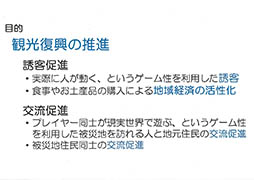 今回の取り組みは観光復興の推進を目的に行われる。実際に人が動くというゲームの利点を生かした誘客や,食事・お土産品の購入といった地域経済の活性化,被災地を訪れる人と地元住民の交流促進などが挙げられた。