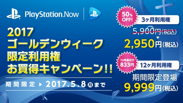 「PS Now」,ゴールデンウィーク限定で「12ヶ月利用権」が登場。「3ヶ月利用権」は50%オフ