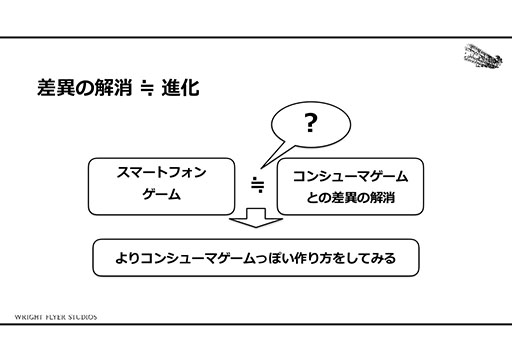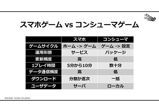WFSがアナザーエデンの開発にあたり,最初に目指したものはスマホでコンシューマゲームのような体験のできるRPGを作ることだった。そこで西田氏達は,スマホゲームとコンシューマゲームの差異について考えたという。
