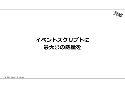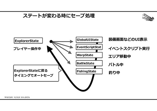 西田氏はこの経験からある確信を持ったという。それは,イベントスクリプトに最大限の裁量を与えること。結果的に,アナザーエデンでは,イベントスクリプトとオートセーブの合わせ技によって,プレイヤーの行動を阻害せず,自由な発想で開発を行っていける環境を作ることに成功したそうだ。