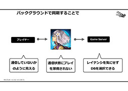 スマホ向けのゲームは頻繁に入るネットワーク処理,チート対策,ランキングなどに対応することに重きを置いたデザインになっている。特にユーザーデータの保持する場所は大きな問題であり,通信待ちが頻繁に発生してしまっている状況を改善しなければならない。コンシューマライクな作品を実現するためには,この部分をシステム的に見直さなければならなかったと西田氏は振り返る。