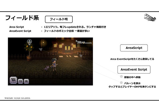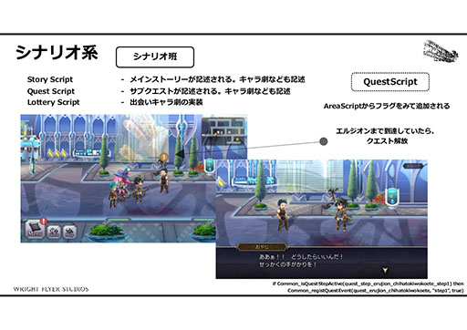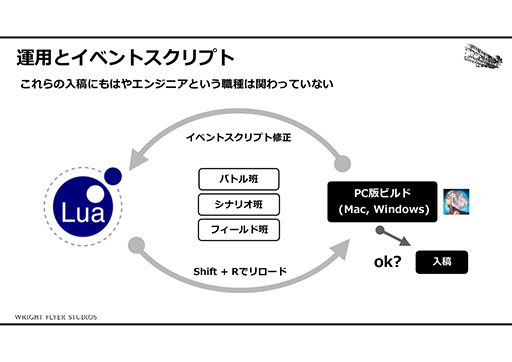 こういった自由な発想から生まれるイベントスクリプトだが,そのレビューにプログラマが関わることは少ないそうだ。実装担当者が思い思いのスクリプトをトライ&エラーで入れていき,新しいスクリプトが生まれた際には共有され,発展していくという。