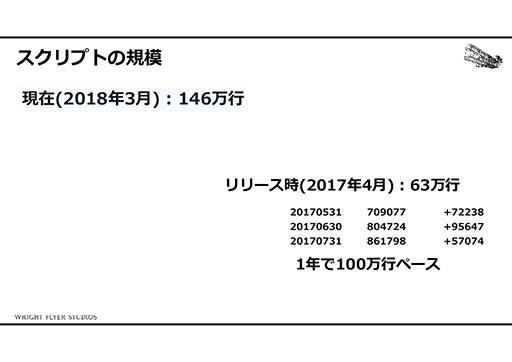 そんな環境で記述されたイベントスクリプトは,現在146万行に登る。西田氏いわく,アナザーエデンのリリース当初は63万行であり,1年で約100万行増えたとのこと。