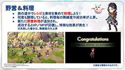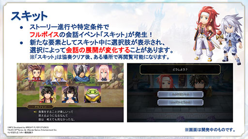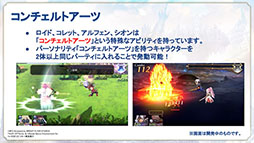 見どころには,フルボイスの会話イベント「スキット」や,旅の道中で見つけたレシピと素材で料理を作る「野営&料理」,特定キャラクターの組み合わせで発生する合体技「コンチェルトアーツ」など,「テイルズ オブ」シリーズらしさを感じられるシステムを盛り込んだ点が挙げられている。