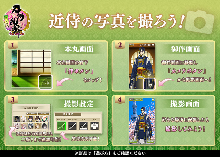 スマホ版「刀剣乱舞-ONLINE- Pocket」に新機能「御伴」が実装。近侍を伴ってさまざまな場所で写真撮影が可能に