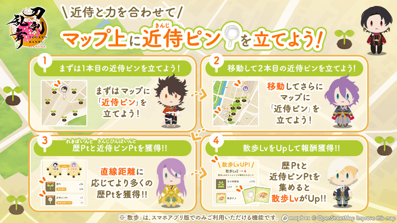 スマホ版「刀剣乱舞ONLINE」,現実のマップと連動した新機能“散歩”を実装。近侍と散歩を楽しみつつ,アイテムを入手できる