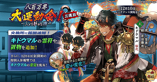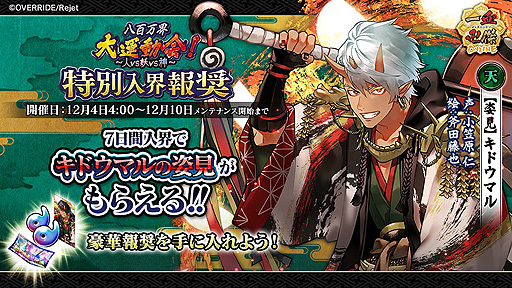 合同会社EXNOA(本社:東京都港区、CEO:村中 悠介、URL: https://games.dmm.com/ )とOVERRIDE(代表:梨木 勇介)は合同会社EXNOAが運営するDMM GAMESにおいて、2020年12月3日(木)メンテナンスで、新英傑「キドウマル」やキドウマルの姿見を手に入れることが出来る「特別入界報酬」の実装を含むアップデートを実施したことをお知らせいたします。