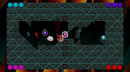 画面の外に弾き出されて,自機の姿が見えなくなっても,あきらめずに粘って操作すると戻ってこれたりもするため,4人で対戦しようものなら熱くなってしまうこと請け合いだ。