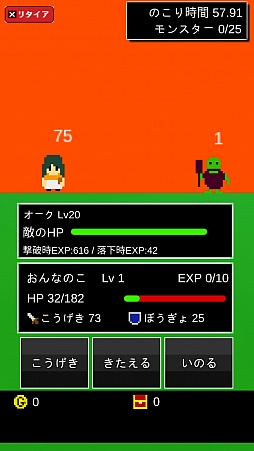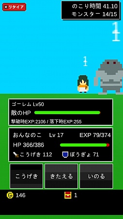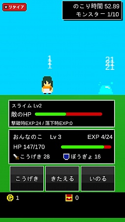 RPGでありながら1分間の制限時間があったり,主人公のレベルが毎回リセットされたりするという変わったシステムが特徴の本作。クリアタイムが記録として残るので,タイムアタックを楽しみながら冒険を進めてみるのも面白いかもしれない。手軽に遊べる育成ゲームを探している人はぜひとも遊んでみてほしい。