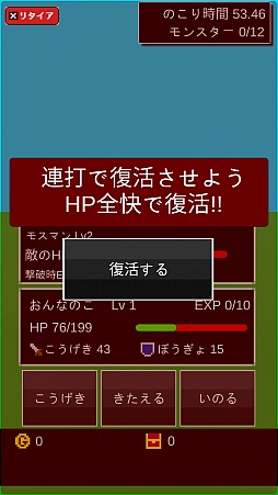 登場モンスターをすべて倒せばステージクリアだが,本作には1分間という制限時間が設けられており,これを過ぎてしまうと,どれだけHPが残っていようとも問答無用でゲームオーバーだ。また,モンスターの攻撃でこちらのHPがなくなってもゲームオーバーにはならないが,主人公の復活にはタップの連打が必要となる。
