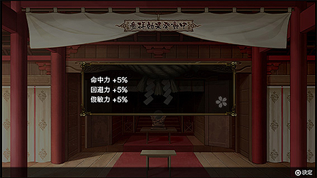 供物を奉納することで参拝効果を得ることができる。次の戦闘のみ命中力や回避力などパーティー全員の能力が上昇する |