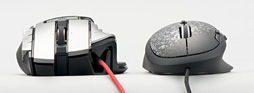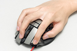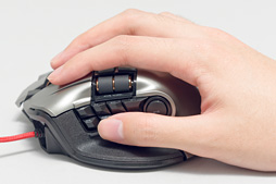 というわけで実際に握ってみるが,このとき基準となるのは左右メインボタンである。スクロールホイールの手前に3個のボタンがあるためか,左右ボタンを軽く押せる範囲はボタン全体のやや奥寄り(=左右メインボタン突端側)にあり,さらに前述のとおり上背があって,メインボタン側に向かって落ちていく角度が急なこともあり,長時間プレイになりがちなMMOプレイヤーのスタイルとしてよくある,手首を机上に置くような浅めの握り方だと,左右メインボタンはやや押しづらい。きちんと(?)「かぶせ持ち」し,手首が机上に触れない持ち方が必須というのが,握り方に関する個人的な結論だ。