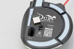 本稿の冒頭でも紹介したとおり,M-DUX70BKはワイヤードとワイヤレスの両対応なのだが,いわゆるゲーマー向けのワイヤード&ワイヤレス両対応マウスとは異なり,主がワイヤード,従がワイヤレスとなっている。本体にバッテリーを搭載しないため,あくまでもワイヤードマウスであって,それとは別に,本体底面に格納されているBluetoothレシーバを別のPCと接続すると,Bluetooth接続のワイヤレスマウスとして(ワイヤード接続してあるPCからの給電によって)利用できる,というわけだ。