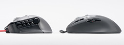 左右メインボタンとセンタークリック機能およびチルト機能付きスクロールホイールを搭載するところは上位モデルと同じで,左メインボタンの左に,上位モデル比でずいぶんと小さくなった[G1]ボタン,スクロールホイールの手前に突起付きの[G2]ボタンを装備。左サイドは上位モデル風だが,見た目がぐっとチープになった9ボタン構成となっている。