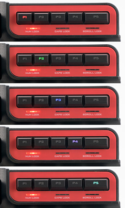 | プロファイル切替ボタンは,左からレッド,グリーン,ブルー,パープル,エメラルドグリーンと色分けされたLEDが点灯する |