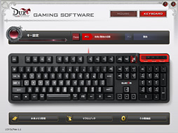 というわけでTK-DUX50BKだが,本製品は,日本語108キー配列に,DUX Gaming Softwareから(マウスと同様に)設定できる最大5つのプロファイルを切り替えるための追加キーがついたタイプだ。搭載するスイッチはメンブレン式で,キーピッチは19mm,キーストロークは4mmとなるため,キー周りの仕様はよくも悪くも「どこにでもあるメンブレン式」である。