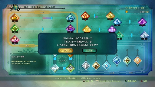 バトルイコライザーには「ドロップの導き」「アクションの極意」「モンスター戦術」「属性と耐性の記憶」の4項目があり,各項目はバトルポイントを使って強化したぶんツマミを動かせるようになる。KGを消費してすべての強化をリセットし,バトルポイントを回収することも可能