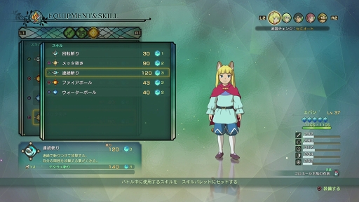 フニャ吸収が可能なスキルは,スキルデータに必要なフニャの属性と数が明記されている。そのスキルをキャラクターに装備させ,対応するフニャを編成するのだ