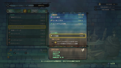 武器工房/仕立工房は,各種装備の“製法書”を研究することで生産可能なアイテムの種類が増えていく。生産する武器/防具にカーソルを合わせて[R3]ボタン(右スティック)を押せば,品質アップに必要な仕上げ素材の入手先も確認できる