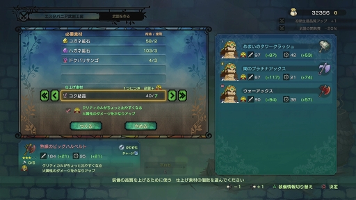 生産する装備品を選んだら,方向キーの左右で仕上げ素材の消費数を選択。品質が6を超えると品質効果が付与され,アイテム名も変化。さらに仕上げ素材を足して生産時に付与できる最大の品質(10)にすると,アイテム名がピンク色になる