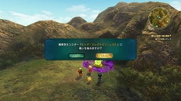 紫のオーラをまとってフィールドに佇む巨大なモンスターは,邪悪な気にあてられて狂暴化した“魔瘴気モンスター”です。周囲に出現する通常の敵より数段強いこのモンスターは,撃破に成功すると,討伐報酬としてエバンたちの衣装やレアな装備品などがもらえますヨ。