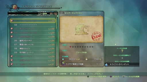 “二ノ国データ”メニューの“魔瘴気リスト”には,魔瘴気モンスターのレベルや目撃値,報酬などの情報が記録される。世界に50種類もいる魔瘴気モンスターの全討伐も,冒険の目標のひとつになる