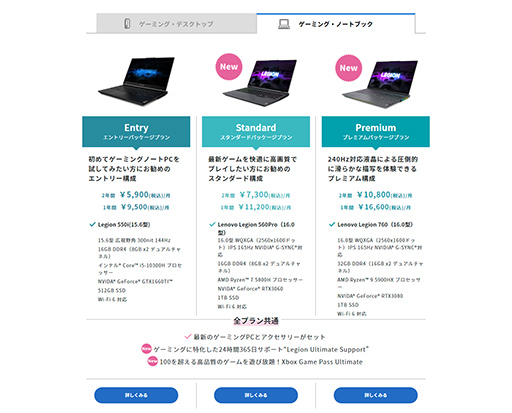 とくに,PC本体だけでなくゲームサブスクリプションサービスのXbox Game Pass Ultimateと,ゲームPCユーザーに特化したサポートプランのLegion Ultimate Supportを追加料金なしで利用できるというのは,かなり魅力的なポイントだ。