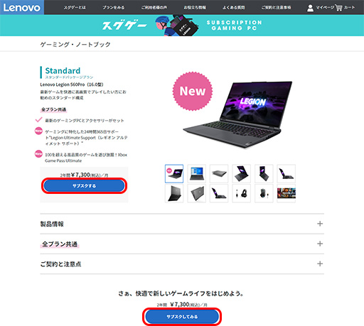 今回試用したのは,スグゲーのスタンダードパッケージプランで提供されているゲーマー向けノートPC「Legion 560Pro(16.0型)」(以下,Legion 560Pro)だ。Lenovo製マウスとヘッドセットも合わせた3点セットである。