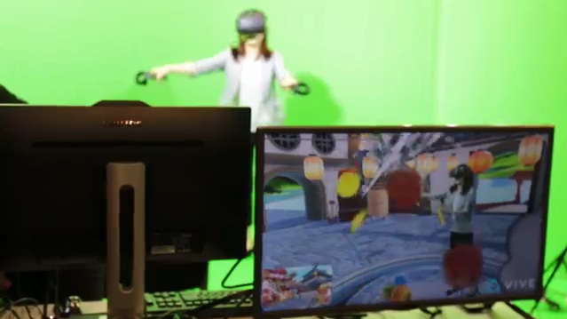 さらに,体験者を外から見たときに「この人はなにをやっているんだろう?」となちがちなVRデモで,グリーンバックMRのシステムが導入されるという。これは背景が緑色の小部屋でVRデモを行い,それを外部カメラから撮影した映像とVCG映像を合成したものを設置したディスプレイに表示することで,体験者がVR空間でどのような動作をしているのかを,外部からも確認できるようになっている。HTCやOculus VRのデモビデオではよく使われている表現なのだが,これは実際に見てもらったほうが理解が早いだろう。