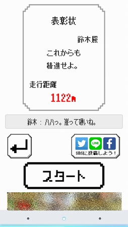 ゲーム内容は非常にシンプルだが,コースはランダム生成となっており,鈴木のコメントが毎回どこかシュールで笑えるので,見た目とは裏腹にわりと遊び倒せるタイトルだ。スコアはTwitter / LINE / Facebookに共有できるので,友達と競い合うのも面白いだろう。